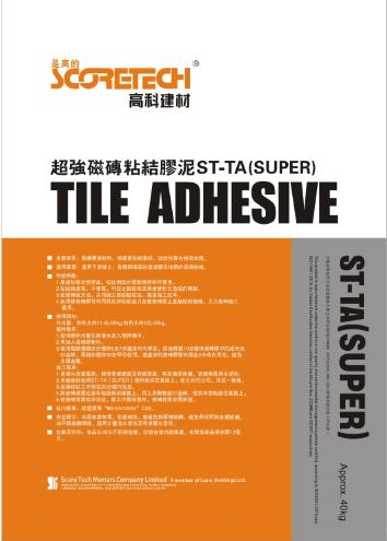 Super high strength polymerized thin bed deformable, flexible, water resistant and efflorescence resistant adhesives complying with C2TE class of BS EN 12004 & S1 class of BS EN 12002 for both interior and exterior wall and floor tile fixing application. ST-TA(Super) is certified to Product Confirmity Certification Scheme - Tile Adhesive (PCCS-TA) issued by HKCI.