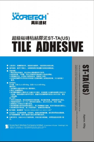 Ultra high strength polymerized thin bed deformable, flexible, water resistant and efflorescence resistant adhesives complying with C2TE class of BS EN 12004 for both interior and exterior wall and floor tile fixing application. ST-TA(US) is certified to Product Confirmity Certification Scheme - Tile Adhesive (PCCS-TA) issued by HKCI.