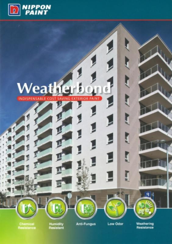 Nippon Paint weatherbond is a high performance waterbased acrylic paint that gives a tough finish. With properties of excellent water resistance, alkali resistance, weathering resistance, dirt resistance, fungus & algae resistance and anti-carbonation property, providing idea performances and protections for interiors and exteriors.
