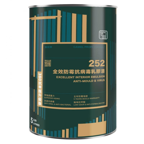 Camel Excellent Interior Emulsion Anti-Mould & Virus 252 series is specially formulated with anti-viral and anti-bacterial performance. It is proven to be effective against virus H1N1 and Staphylococcus aureus, efficacy is over 99.9%. This product is also anti-bacterial and mould proof.